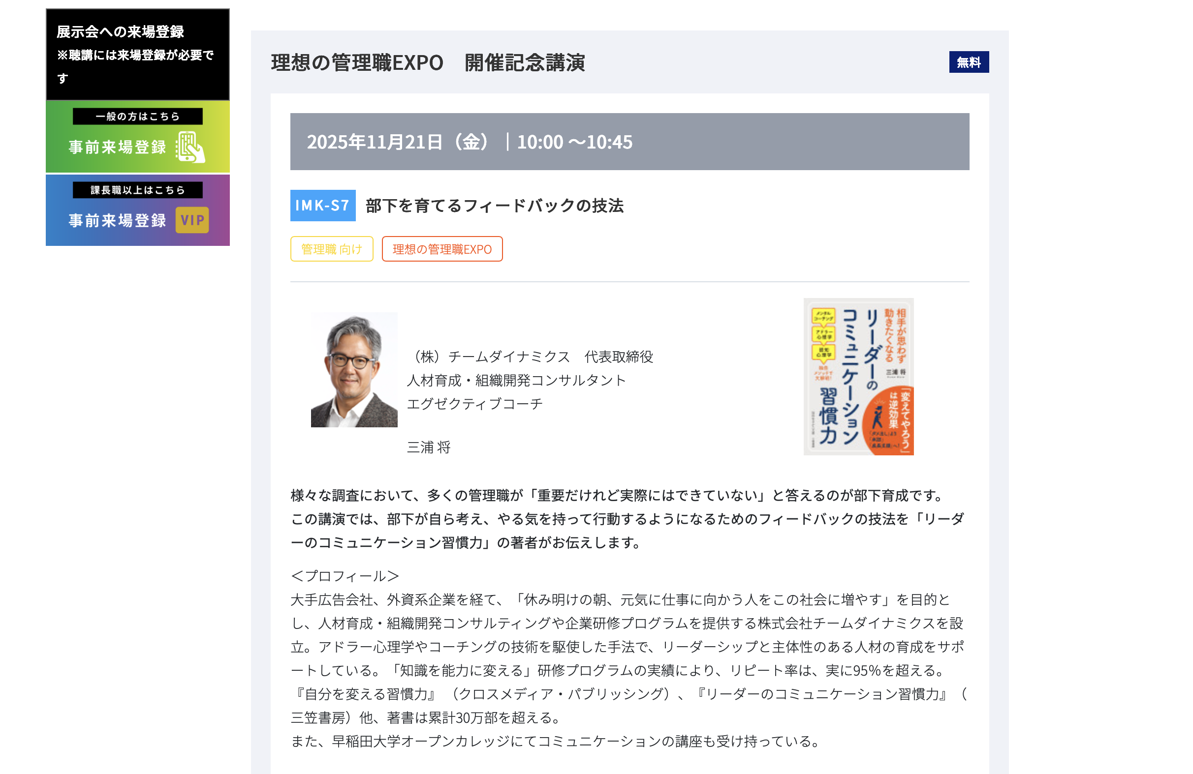 この講演では、部下が自ら考え、やる気を持って行動するようになるためのフィードバックの技法を「リーダーのコミュニケーション習慣力」の著者である代表三浦がお伝えします。
